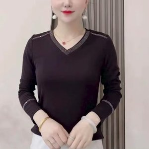 一件代发直播爆款2025春秋季V领纯色烫钻显瘦长袖T恤女打底衫上衣