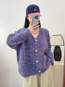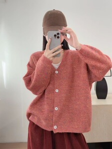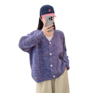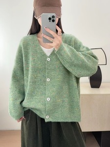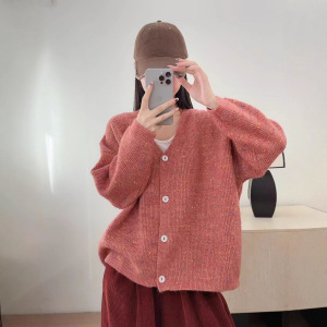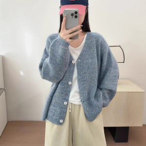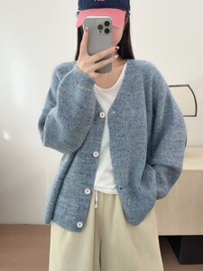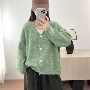 新品韩版宽松休闲简约V领毛衣花纱针织开衫外套