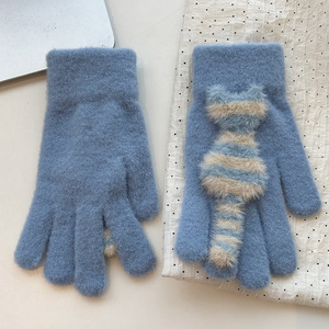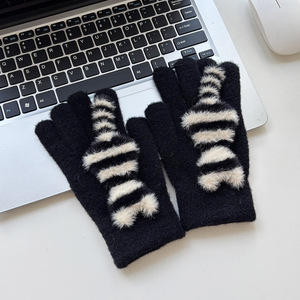 韩版个性撸猫女士保暖手套秋冬季防寒加厚毛呢露两指触屏骑行五指