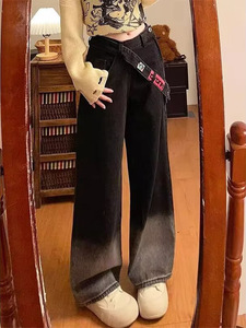 侧边拉链渐变阔腿牛仔裤女春季新款美式复古高腰宽松显瘦直筒长裤