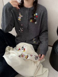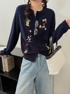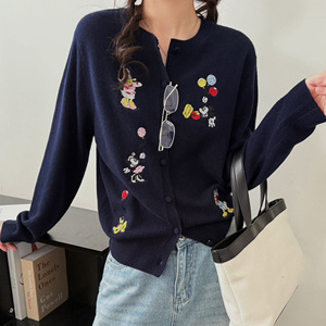 早秋新款100%全羊毛圆领长袖米奇刺绣羊毛针织衫开衫宽松百搭上衣