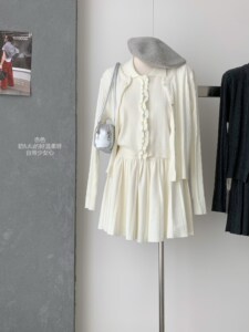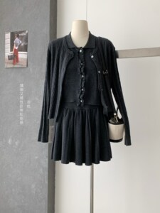 2025秋季学院风三件套 翻领针织背心+百搭开衫+A字百褶短裙子