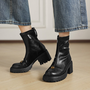 显瘦显高优雅百搭山茶花瘦瘦靴2025秋冬粗高跟圆头羊皮弹力短靴女