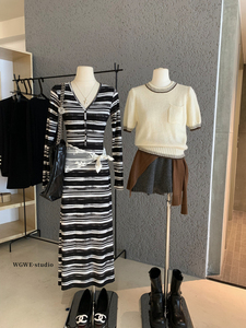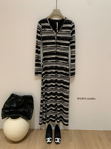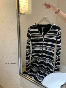WGWE秋季韩系纯欲撞色条纹收腰显瘦V领长袖包臀长款连衣裙女W7077