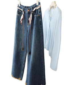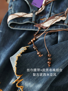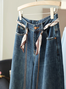 复古游牧风 丝巾腰带脚口刺绣 高腰A字直筒阔腿牛仔裤女秋G091212