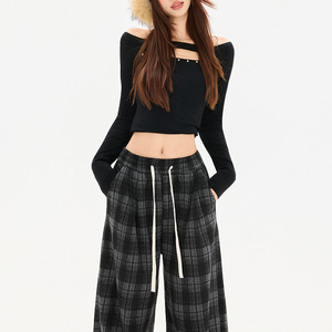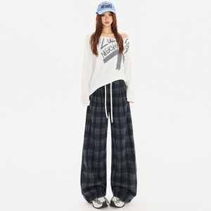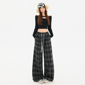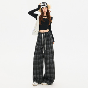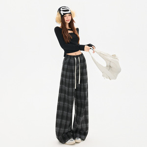 休闲裤女秋季黑灰慵懒风格纹直筒垂感显瘦梨形身材宽松格子阔腿裤