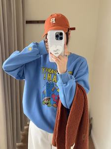韩系慵懒风芝麻街袖口曲奇刺绣卡通印花卫衣女秋季新款圆领上衣