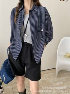 琪镌绘制条纹衬衫秋季新款宽松休闲女装百搭长袖翻领通勤衬衣上衣