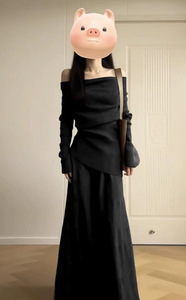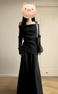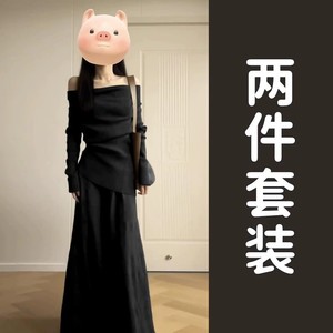 一字肩黑色针织连衣裙子女装早秋季2025新款小个子巨好看套装长裙