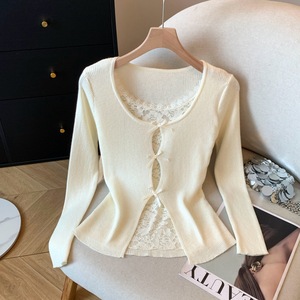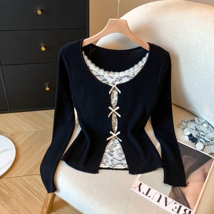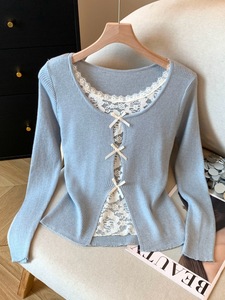 法式小香风假两件蝴蝶结长袖t恤女秋季新款蕾丝拼接开叉修身上衣
