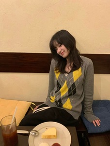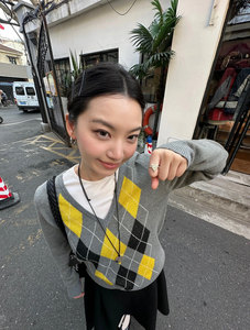 现货高品质MIU系韩版设计学院风撞色菱格V领针织衫套头毛衣代发
