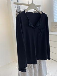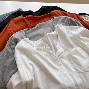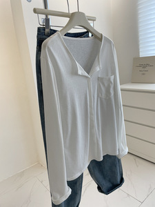 开口小V领设计~口袋长袖打底衫女!秋季慵懒百搭宽松纯色休闲上衣