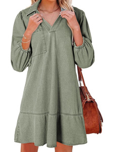 亚马逊独立站2025新款欧美跨境女装休闲娃娃装V领七分泡泡袖牛仔