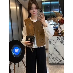 欧货高级感刺绣马甲女2025秋季新款无袖圆领纽扣百搭洋气马夹外套