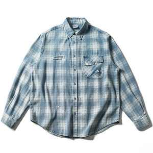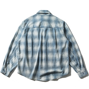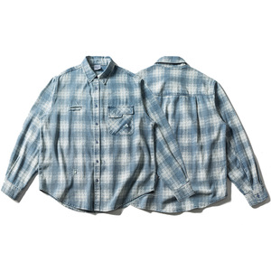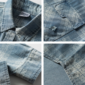 日系复古水洗破洞补丁格纹牛仔工装衬衫男女宽松vintage长袖衬衣