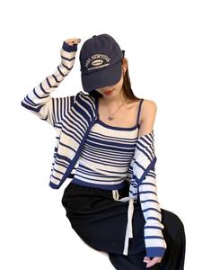 撞色条纹长袖针织开衫女韩版气质早秋内搭打底吊带背心上衣两件套