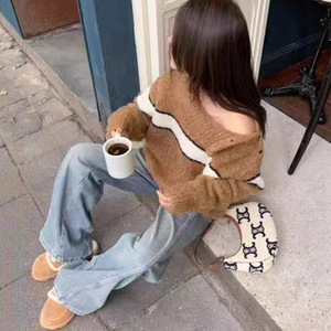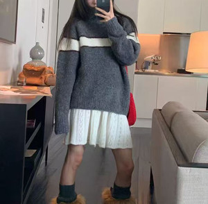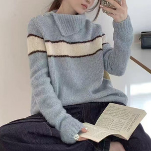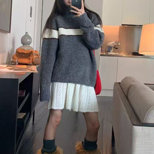 秋冬撞色节日感蓬松羊驼绒侧开扣宽松慵懒设计感高领翻领毛衣女