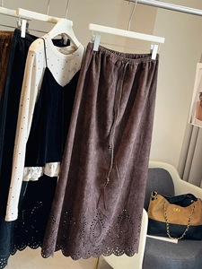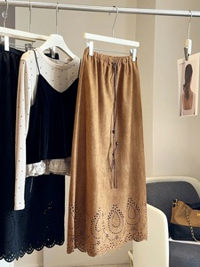 设计感镂空麂皮绒半身裙女2025秋复古抽绳松紧腰百搭a字中长裙子