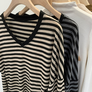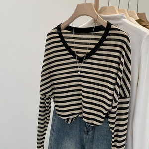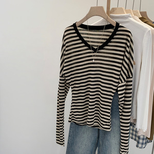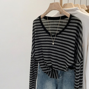 慵懒黑色V领条纹长袖T恤女装韩版早秋2025新款美式漂亮设计感上衣
