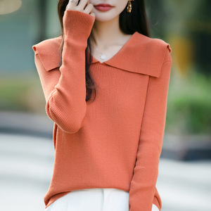 大码韩版洋气翻领纯色针织衫女秋冬款修身显瘦打底衫长袖上衣女装