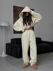 跨境休闲欧美女士开衫套装纯色长袖拉链连帽卫衣松紧阔腿裤二件套