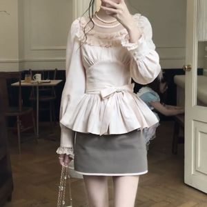 日系甜美感长袖衬衣套装女秋季设计感收腰撞色显瘦短裙两件套2025