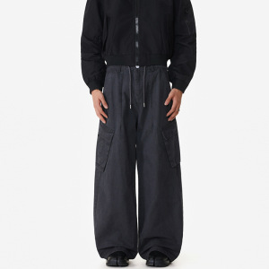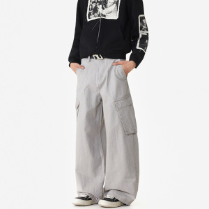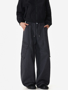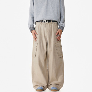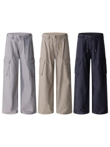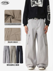 LKTM男装 美式复古纯棉暗格纹多口袋工装裤男女抽绳直筒阔腿长裤