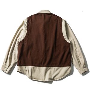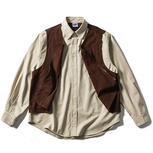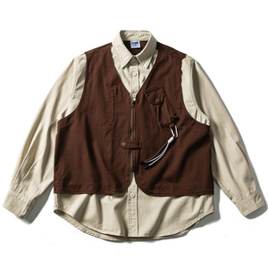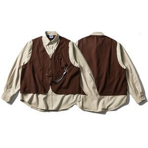日系复古阿美咔叽水洗假两件马甲拼接工装衬衫男女宽松长袖衬衣潮