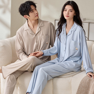 双面抽条40支200克抽条纯棉情侣睡衣秋季翻领开衫长袖长裤男套装