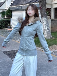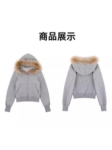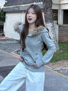 系连帽开衫拉链卫衣女2025秋季字母印花宽松显瘦可拆卸毛领上衣潮