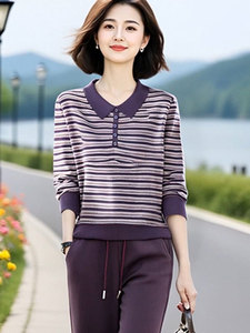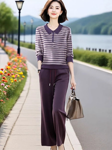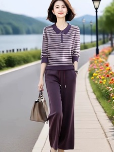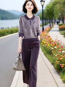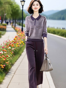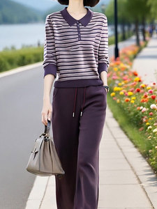早秋2025新款时尚洋气假两件条纹针织衫高腰显瘦休闲裤两件套女装