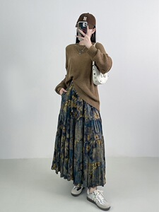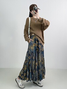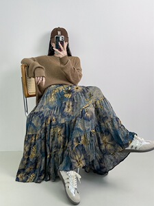 复古花朵高腰A字半身长裙春秋新款遮胯褶皱蛋糕裙口袋法式花裙子