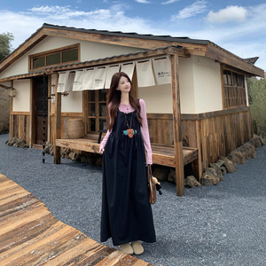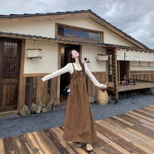 实拍秋季韩版艺术生背带裙抽绳宽松A字连衣裙+撞色纽扣针织打底衫