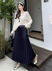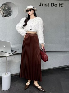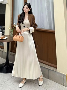 跨境重工双压褶半身裙女中长款超高腰显瘦显腿长小A型百褶半身裙