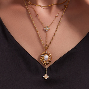 鑫艺鑫不锈钢四叶花Y字流苏锁骨链镀18k金精致仿珍珠叠戴项链组合