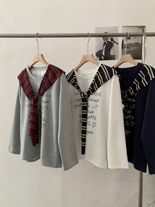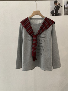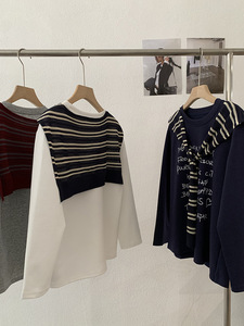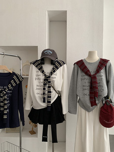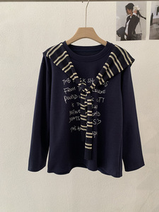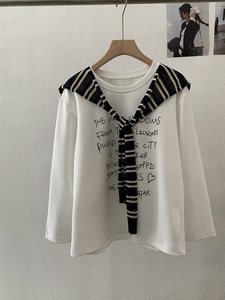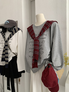 欧玛莱 字母印花圆领长袖套头卫衣搭条纹针织披肩两件套上衣 4871