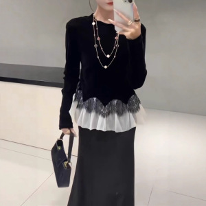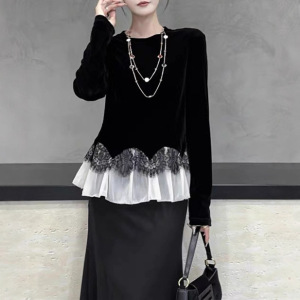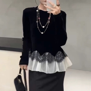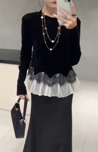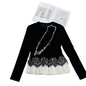 南油代发法式时尚荷叶蕾丝植绒T恤25秋款优雅气质上衣长袖不退换