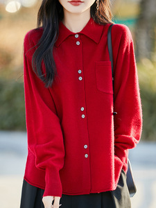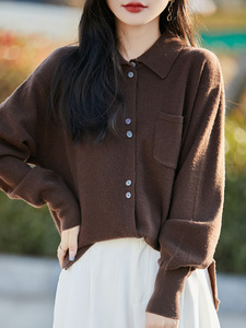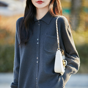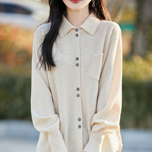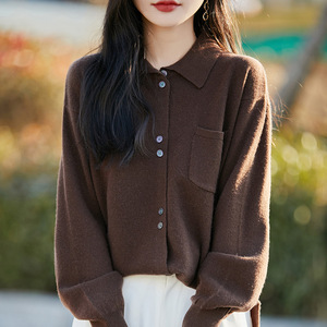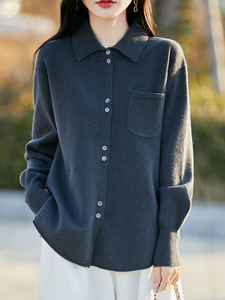 气质纯羊毛POLO领针织开衫毛衣女宽松慵懒秋冬装打底衬衫外套上衣