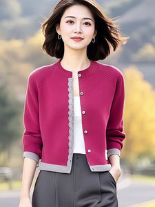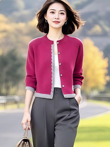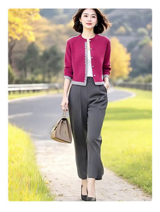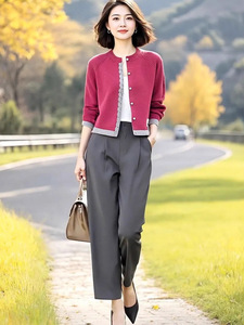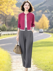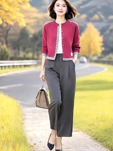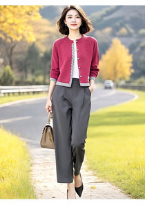 红色时尚针织上衣时髦洋气套装2025秋冬新款通勤休闲西裤两件套女
