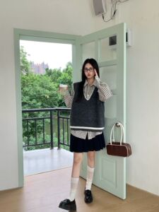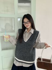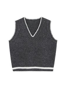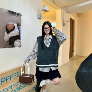 灰色学院风V领无袖针织背心女秋冬新款韩系宽松休闲百搭慵懒上衣