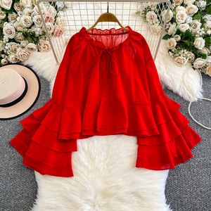 法式甜美仙气衬衫女秋季御姐风遮肉设计别致洋气荷叶边喇叭袖上衣