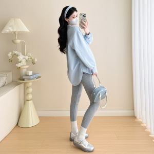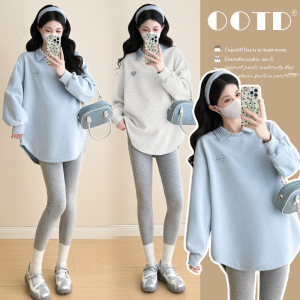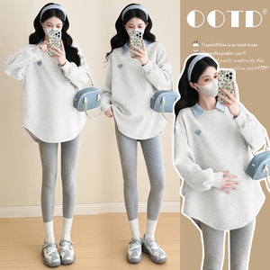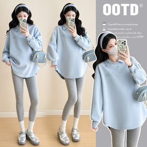 孕妇中长款卫衣秋冬新款时尚翻领假两件卫衣长袖上衣宽松显瘦百搭
