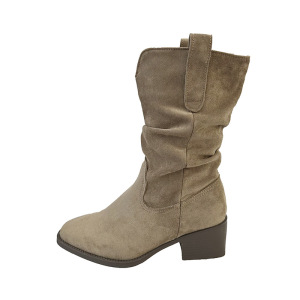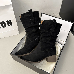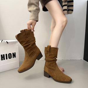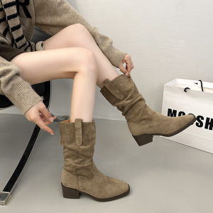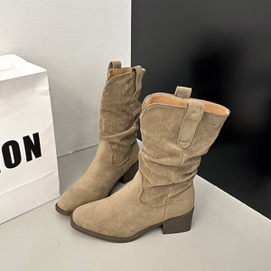复古绒面卡其色中高筒靴西部靴女靴子2025早秋新款粗跟尖头堆堆靴