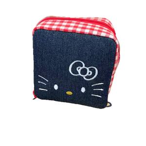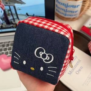 可爱猫咪刺绣收纳包新款红格牛仔便携小方包豆腐包女大容量化妆包