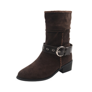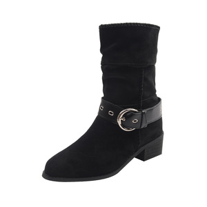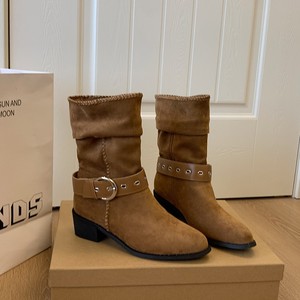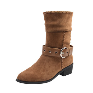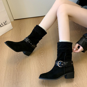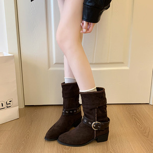 真皮褶皱尖头堆堆靴女2025秋季新款复古西部牛仔靴复古中筒骑士靴
