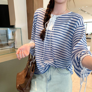 早秋高级感抽绳系带条纹长袖针织衫女2025新款宽松显瘦气质上衣