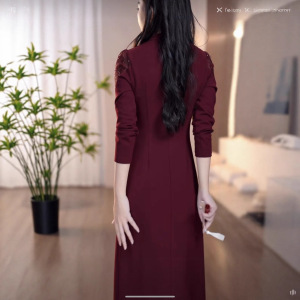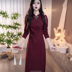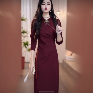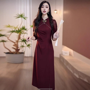 高端洋气酒红色礼服裙2025秋新款收腰显瘦遮肉棉感气质减龄时尚裙