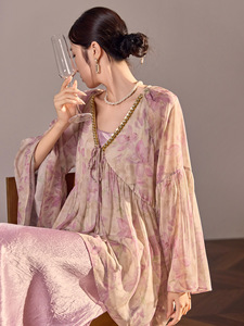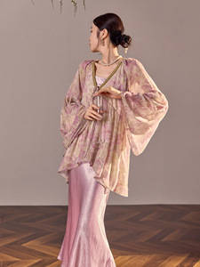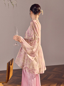 秋季新款国风V领灯笼袖雪纺上衣新中式镶钻印花设计衬衫女 N6094