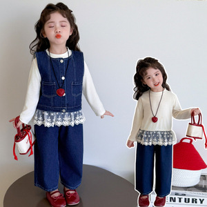 儿童套装早秋2025新款洋气时髦女宝宝春秋韩版花边打底牛仔三件套