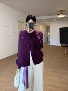 韩版学院风紫色开衫毛衣女秋季2025新款宽松显瘦休闲显白百搭上衣